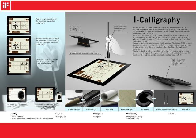 2016年4月7日全球工业设计权威奖项——德国IF设计奖评委会公布了2016年度概念奖的获奖名单。红足官网工业设计系刘奕廷同学提交的“I Calligraphy”作品从11000多件参赛作品中脱颖而出,获得IF概念设计奖(iF STUDENT DESIGN AWARD 2016)。
