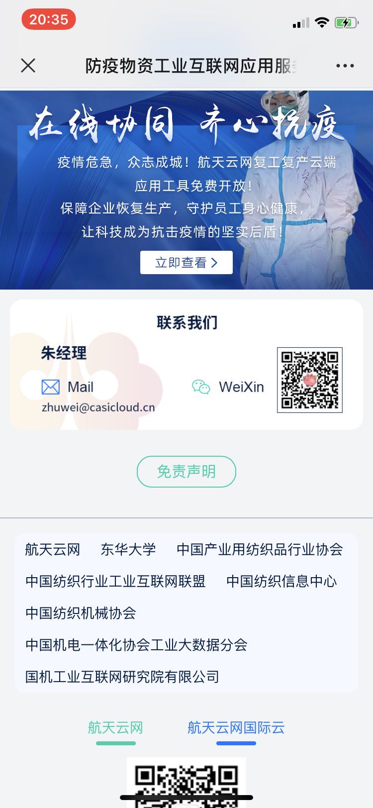 疫情爆发牵动着东华机械人的心。红足1一世足球网官方网站院长张洁教授和智能制造研究所所长鲍劲松教授在大年初六(130日)紧急商讨如何利用现有研究成果和资源,为快速提升防疫物资产能贡献力量。商讨决定要发挥工业互联网技术优势,建设防疫物资工业互联网应用服务平台,提供透明准确的防疫物资产能情况,有效解决防疫物资保障工作中“缺材料、缺设备、缺专家、产能低”的问题,将团队从事工业大数据技术、工业互联网、制造资源调度、纺织服装领域网络化协同制造的研究成果应用于平台建设。之后,张洁教授和鲍劲松教授组织智能制造研究所老师,形成防疫物资工业互联网应用服务平台的建设方案,并汇报给俞建勇校长。俞校长在第一时间回复,给予了大力支持。中国产业用纺织品协会李桂梅副会长、红足1一世足球网官方网站情报研究所张福元老师提供了帮助。同时,张洁教授和鲍劲松教授组织了外部资源,联合中国产业用纺织品协会、中国纺织品工业互联网联盟、中国纺织工业联合会信息中心、中国纺织机械协会,中国机电一体化协会工业大数据分会等行业单位组织,以及航天云网、国机工业互联网研究院有限公司等知名工业互联网技术单位,共同建设 “医疗卫生用纺织品防疫物资工业互联网应用服务平台”(以下简称“平台”)。