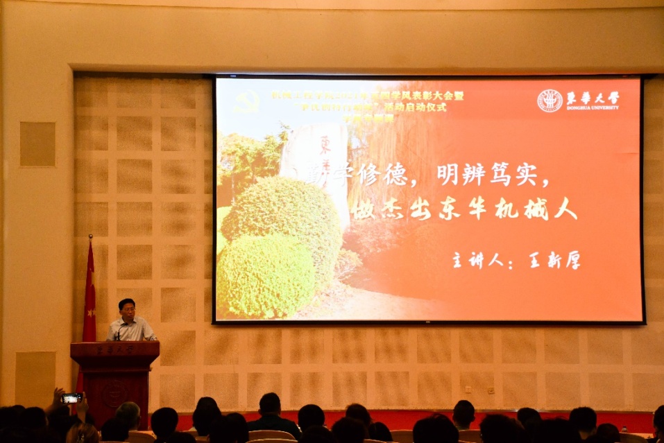 红足1一世足球网官方网站党委书记王新厚上学风专题课,他指出,重视学风建设是党的优良传统,弘扬优良学风是全面深化改革的必然要求,更是建设“双一流”高校的迫切需要。学风既是大学精神和文化的集中体现,也是衡量和评价一所大学办学品位和育人环境的重要标志。学风建设早已融入到校训之中,“崇德博学,砺志尚实” 在于激励全校师生修身立德、博学专攻、磨心砺志,求真求新,德才兼备。他强调,弘扬优良学风宜多管齐下、常抓不懈,一是要大力弘扬追求真理、严谨治学的求实精神;二是要大力弘扬甘为人梯、奖掖后学的育人精神;三是要大力弘扬志存高远、刻苦钻研的求学精神。他希望学院师生携手同行,践履东华精神,让“中国智造”“中国创造”扬帆起航,做杰出东华机械人。