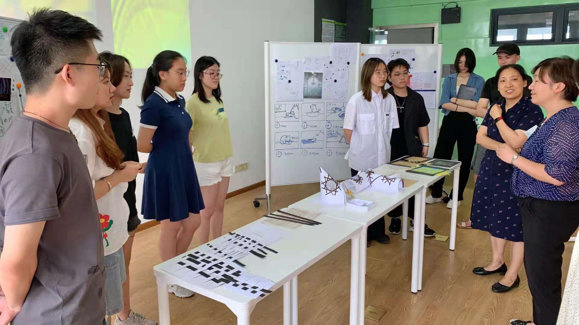在为期4天的课程中,Carmelo和Monica 鼓励同学们积极思考非物质文化对个人的意义和价值;通过案例分析让大家了解非物质文化遗产传承的一般方法;通过组织访谈帮助同学们深入理解竹编工艺和它所面临的问题;利用图片、杂志、视频等视觉刺激物打开同学们的脑洞、启发他们的设计思路;运用PCEE工具从不同的维度分析和评价设计方案,并引导同学们在草模制作的过程中探索设计、发展方案。在课程的最后,我们再次邀请程丽老师来到工作坊,听取各项目组的作品发表并给予反馈。程丽老师对同学们4天的研究成果颇感兴趣,给予了高度的评价,表示将设计与竹编技艺结合从而提升竹编制品的艺术感和设计感是对该非物质文化遗产传承与保护最大的助力。