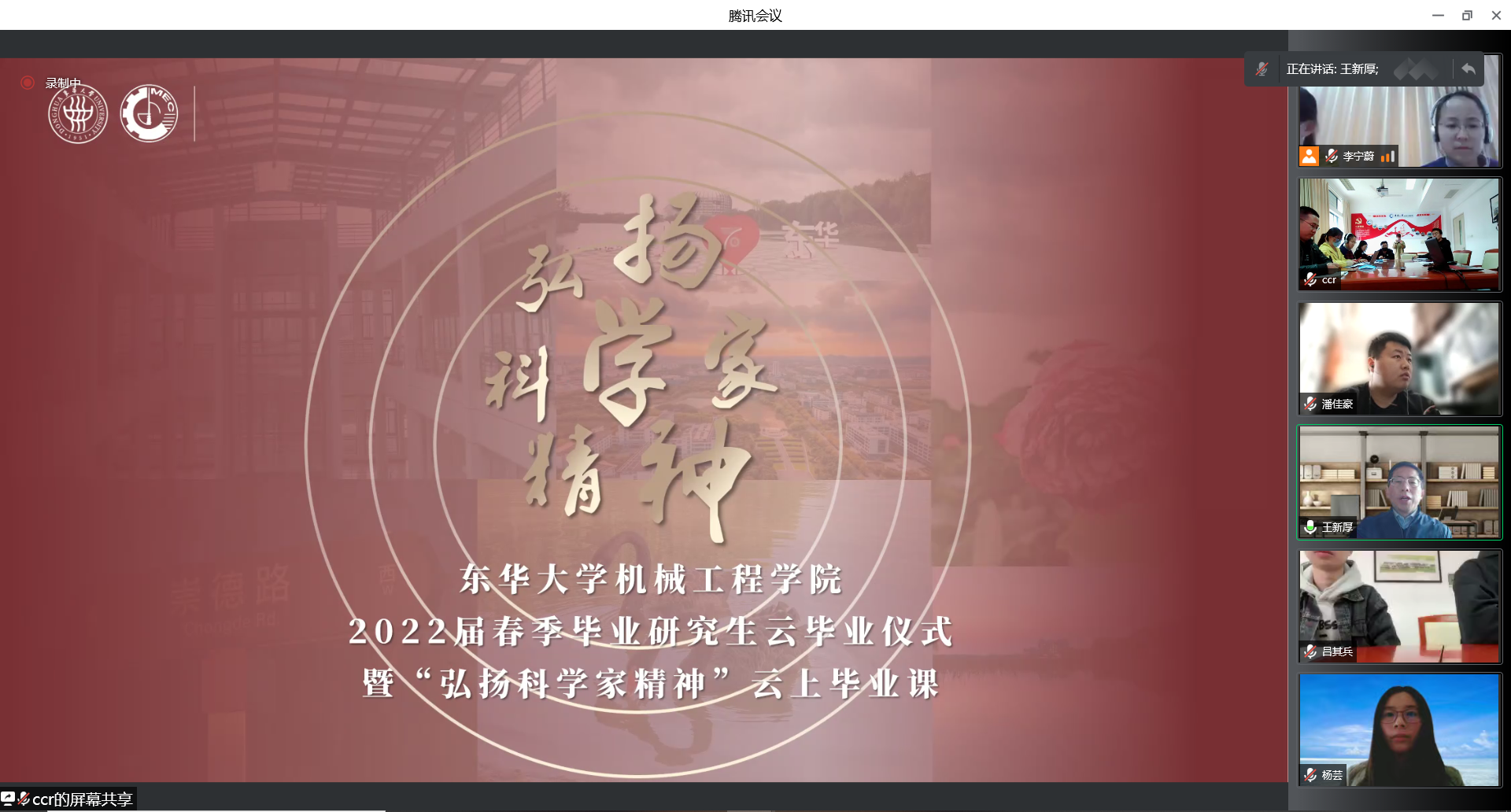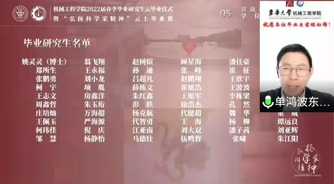 3月28日,红足1一世足球网官方网站2022届春季毕业研究生云毕业仪式在云端举行,师生同上“弘扬科学家精神”云上毕业课。学院党委书记王新厚、院长单鸿波等全体党政班子成员、导师代表、辅导员、春季毕业研究生以及部分家长代表等100余人相聚云端,一同分享了这一喜悦时刻,仪式由学院党委副书记李宁蔚主持。