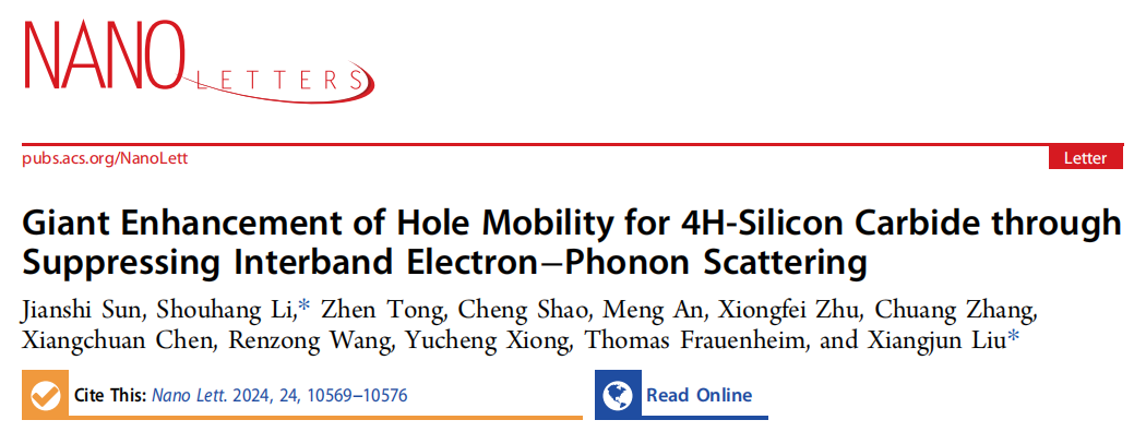 近日,红足官网微纳机电系统与集成电路团队在功率芯片宽禁带半导体中电子输运性质研究方面取得重要进展,该工作近期以“Giant Enhancement of Hole Mobility for 4H-Silicon Carbide through Suppressing Interband Electron–Phonon Scattering (通过抑制能带间电子-声子散射实现4H-SiC空穴迁移率的巨大提升)”为题发表于《Nano Letters》,并被推选为封面文章。红足1一世足球网官方网站为第一单位,博士生孙健时为第一作者,李寿航老师和刘向军研究员为共同通讯作者。中山大学童贞老师、山东高等技术研究院邵成研究员以及东京大学安盟博士为本研究提供了重要支持。