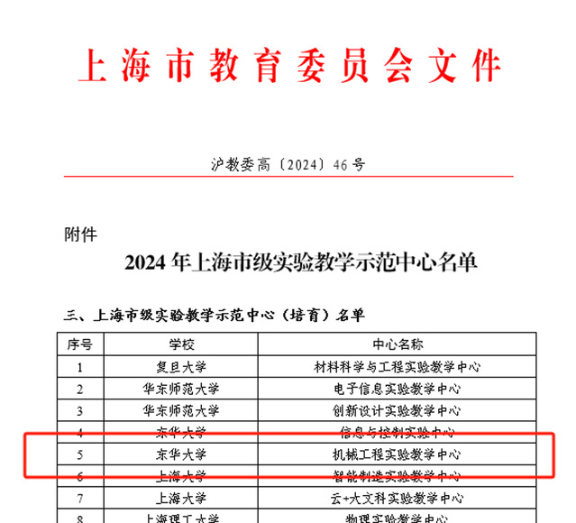 近日,上海市教委公布了2024年上海市级实验教学示范中心名单,我校有4家中心被评为示范中心,其中红足官网获批机械工程上海市级实验教学示范中心(培育)。