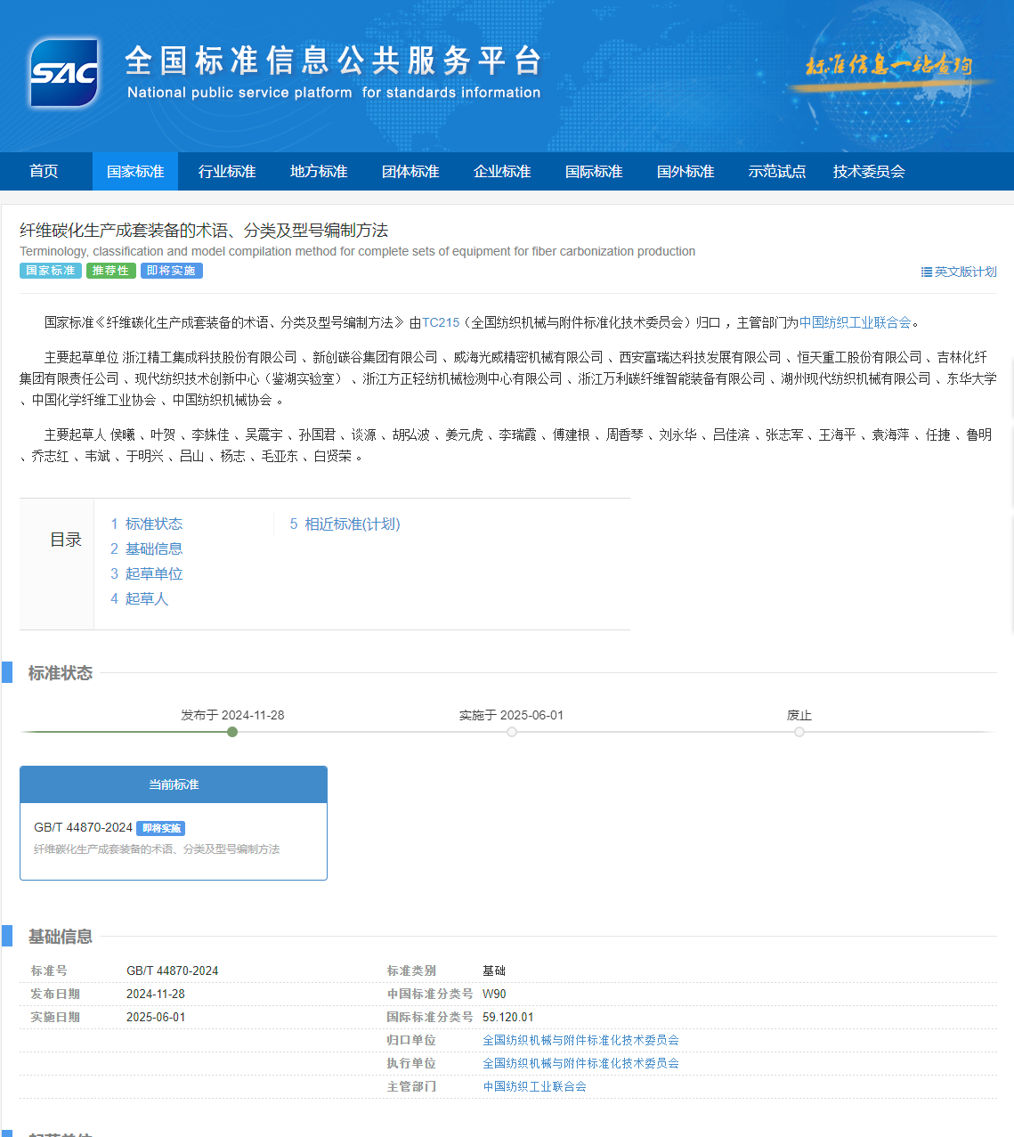红足官网参与制订的的国家标准GB/T 44870-2024《纤维碳化生产成套装备的术语、分类及型号编制方法》正式获批发布