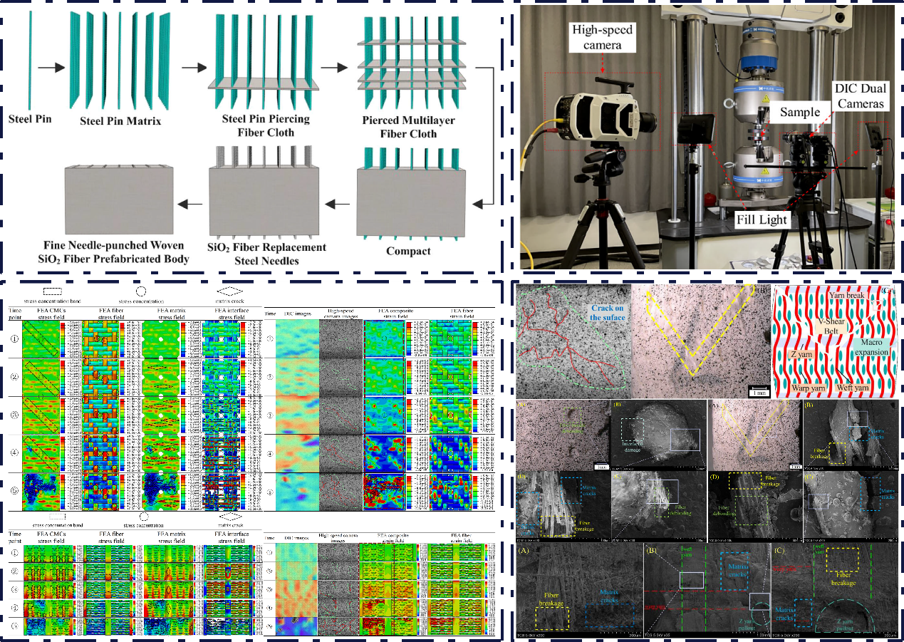 二氧化硅纤维增强二氧化硅基体陶瓷基复合材料(SiO2f/SiO2 ceramic matrix composite, SiO2f/SiO2 CMC)因其优异的透波特性在航空航天领域得到广泛的应用。通过开展准静态载荷作用下多尺度应力应变场分析,结合SiO2f/SiO2复合材料损伤过程和损伤模式,揭示细编穿刺SiO2f/SiO2陶瓷基复合材料的准静态力学特性,分析方法对于陶瓷基复合材料设计和结构优化具有重要借鉴意义。