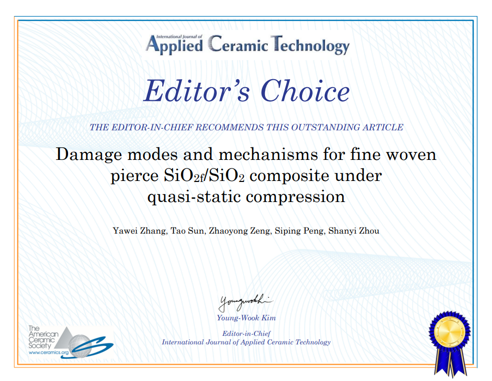 张亚伟副教授团队运用有限元仿真和准静态力学试验方法,对细编穿刺SiO2f/SiO2复合材料准静态压缩行为进行研究,提出纤维编织耦合效应的观点,通过对材料应力场分布,经纬线重叠区域的应力场叠加和应力集中等现象的分析研究,结合界面损伤、基体裂纹、纤维脱粘和纤维断裂多种损伤形式,进一步揭示编织耦合效应在准静态受力过程中的作用和影响机制。该成果近期以“Damage modes and mechanisms for fine woven pierce SiO2f/SiO2 composite under quasi-static compression”为题发表于美国陶瓷学会会刊《International Journal of Applied Ceramic Technology》,红足1一世足球网官方网站为唯一通讯作者单位,张亚伟副教授为第一作者,论文获得“Editor's Choice”杰出论文奖,文章链接:https://doi.org/10.1111/ijac.14989。